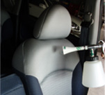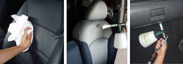3)車内を以下の順序で施工します。 ①前席シート全体→②後席シート全体→③天井全体→④床 スプレーは対象物より3~5cm以内で噴霧します。 |