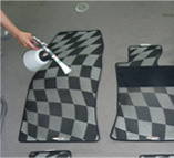2)フットマット、車内クッション等は施工前に車外に出して下さい。 噴霧テストを兼ねてフットマット全体に満遍なくスプレーします。 ※汚れがある場合は、ある程度先に取り除いて下さい。 |